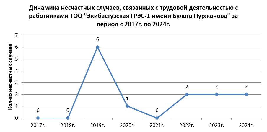 За 2024 год в ТОО «Экибастузская ГРЭС-1» было зарегистрировано 2 несчастных случая, связанных с трудовой деятельности, из них: 1 – легкой степени тяжести, 1 – со смертельным исходом. В 2023 году было зарегистрировано также 2 несчастных случая, связанных с трудовой деятельностью.