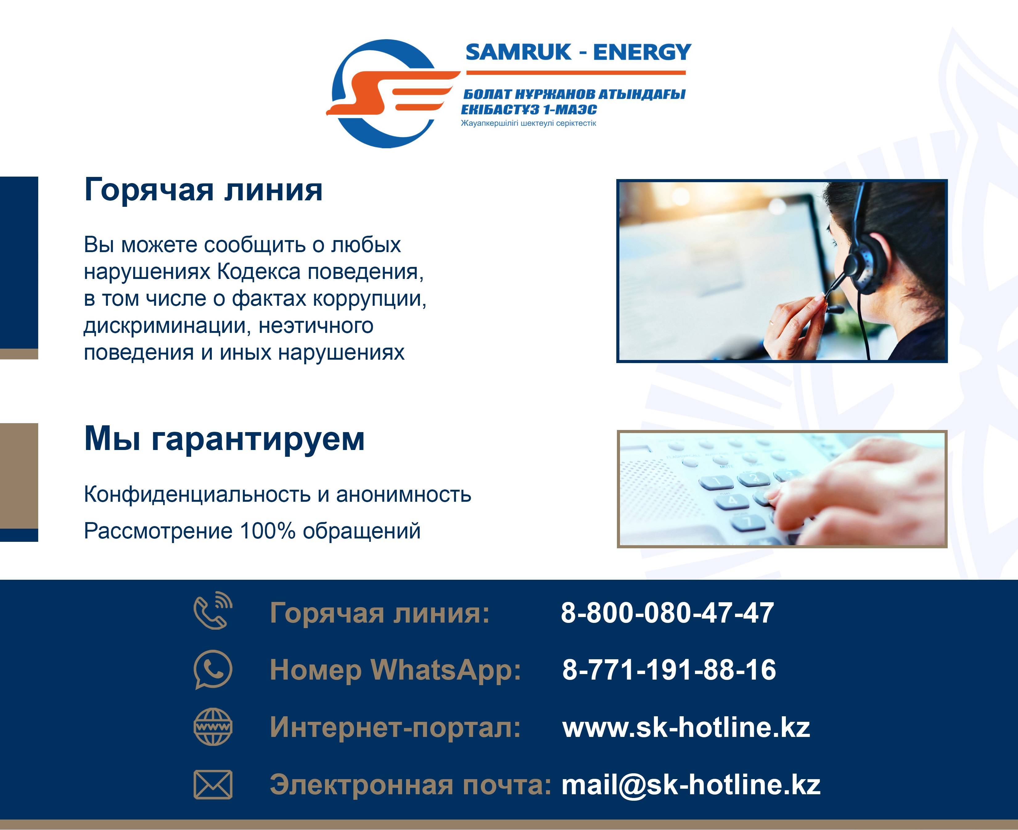 АО «Самрук-Энерго» сообщает, что Горячая линия является каналом информирования о предполагаемых нарушениях законодательства и/или Кодекса поведения, случаях мошенничества, коррупции, несанкционированного разглашения конфиденциальной и инсайдерской информации. По вопросам, связанным с продуктами и услугами, а также для официального обращения к руководству АО «Самрук-Энерго» и дочерних и зависимых компаний следует использовать службы поддержки клиентов и контакты, указанные на корпоративных сайтах компаний. Жалобы на действия и решения заказчика, организатора, конкурсной комиссии, экспертной комиссии, оператора информационной системы электронных закупок компаний группы АО «Самрук-Казына» следует подавать через веб-портал закупок zakup.sk.kz в соответствии с законодательством Республики Казахстан.